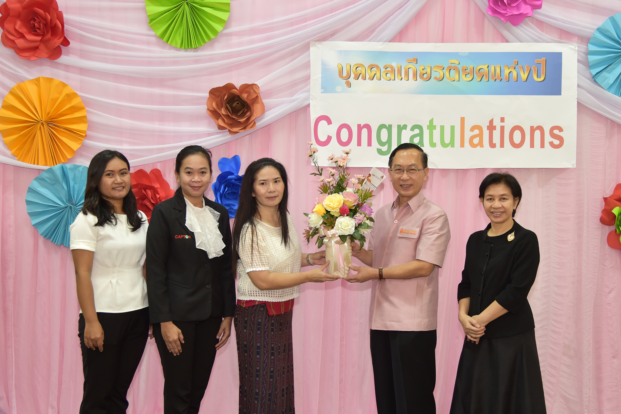 ผู้ช่วยศาสตราจารย์ ดร.ชื่นจิตร อังวราวงศ์ รองคณบดีฝ่ายบริหาร พร้อมด้วย นางดารารัตน์ อุ่นคำ หัวหน้าสำนักงานคณบดี และบุคลากรคณะฯ ร่วมทำบุญตักบาตรและมอบช่อดอกไม้ร่วมแสดงความยินดีกับหน่วยงานในมหาวิทยาลัยขอนแก่น เนื่องในโอกาสครบรอบวันครบรอบสถาปนา ซึ่งได้แก่ วิทยาลัยบัณฑิตศึกษาการจัดการ (MBA) คณะแพทยศาสตร์ โดยได้รับเกียรติจาก รองศาสตราจารย์ ดร.วินิต ชินสุวรรณ คณบดีวิทยาลัยบัณฑิตศึกษาการจัดการ และ รองศาสตราจารย์ชาญชัย พานทองวิริยะกุล คณบดีคณะแพทยศาสตร์ ร่วมรับมอบดอกไม้แสดงความยินดีตามลำดับ