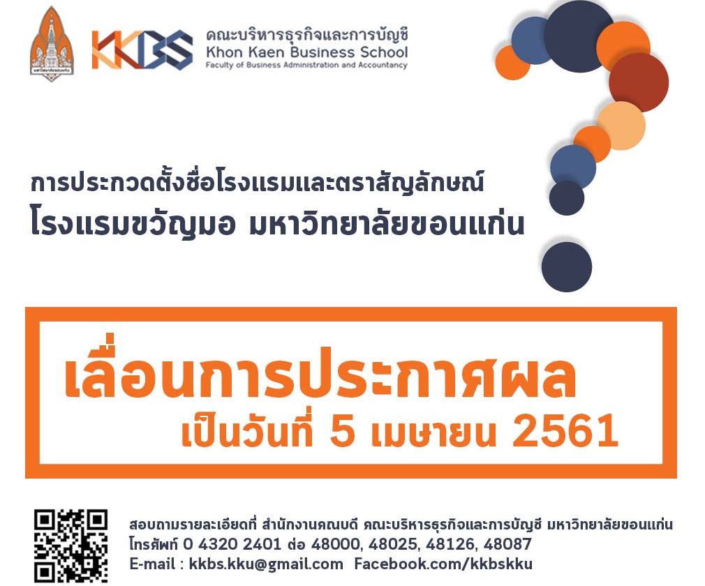 ตามที่ คณะบริหารธุรกิจและการบัญชี มหาวิทยาลัยขอนแก่น ได้เชิญชวนบุคลากร นักศึกษา ศิษย์เก่า มหาวิทยาลัยขอนแก่นประกวดตั้งชื่อโรงแรมและตราสัญลักษณ์ (จากชื่อเดิมโรงแรมขวัญมอเป็นชื่อใหม่) รอบที่ 2 ภายใต้แนวคิด “อีสานร่วมสมัย ภูมิปัญญาแห่งอีสานและรวมความภูมิใจของชาว มข.” ชิงเงินรางวัลกว่า 23,000 บาท โดยเปิดรับผลงานตั้งแต่ วันที่ 7 กุมภาพันธ์ 2561 – 16 มีนาคม 2561 และจะประกาศผลสู่สาธารณะในวันที่ 31 มีนาคม 2561