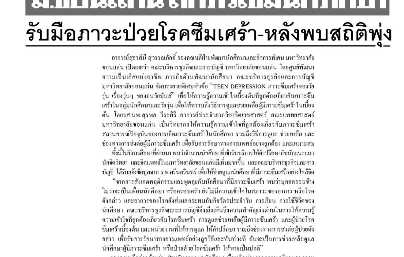 ข่าวสด-ม.ขอนแก่น ถกเข้มนักศึกษา รับมือภาวะป่วยโรคซึมเศร้า-ห ลังพบสถิติพุ่ง