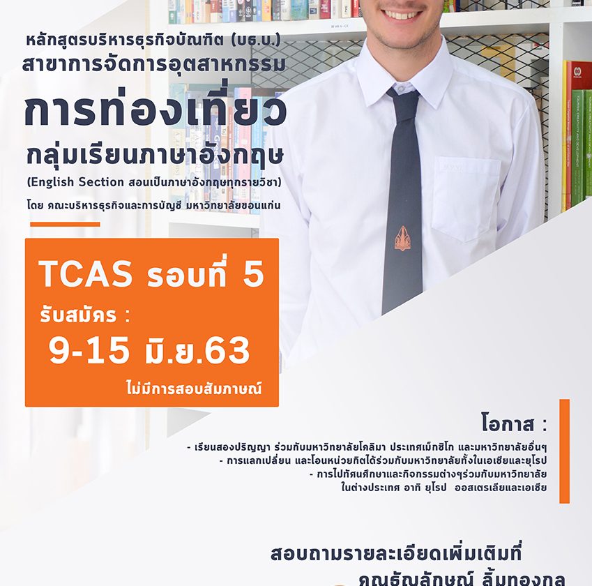 คณะบริหารธุรกิจและการบัญชี มหาวิทยาลัยขอนแก่นเปิดรับสมัครคัดเลือกบุคคลเข้าศึกษาระดับปริญญาตรี TCAS รอบที่ 5 หลักสูตรบริหารธุรกิจบัณฑิต (บธ.บ.) สาขาการจัดการอุตสาหกรรมการท่องเที่ยว กลุ่มเรียนภาษาอังกฤษ (English Section สอนเป็นภาษาอังกฤษทุกรายวิชา) เปิดรับสมัครระหว่างวันที่ 9 – 15 มิถุนายน 2563