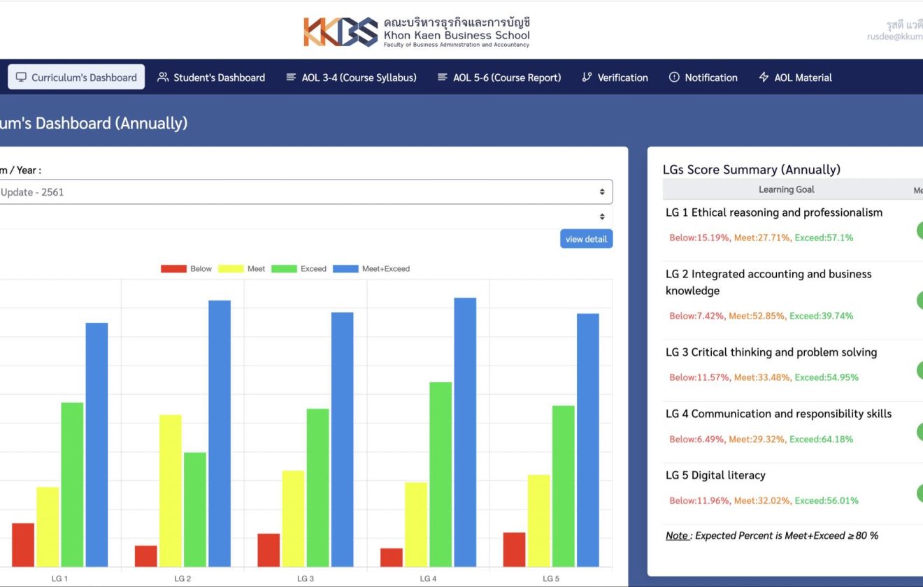 ภายใน“ระบบ KKBS AoL”จะประกอบไปด้วยส่วนจัดเก็บข้อมูลประมวลรายวิชา (Course Syllabus) รายงานผลการดำเนินการของรายวิชา (Course Report) การวิเคราะห์ผลลัพธ์การเรียนรู้ของนักศึกษา (Student Dashboard) การวิเคราะห์ผลลัพธ์การเรียนรู้ของหลักสูตร (Curriculum Dashboard) การทวนสอบออนไลน์ (Verification) และการจัดทำใบรับรองผลการเรียนที่ระบุทักษะของผู้เรียน (Skill Transcript) ทั้งนี้ “ระบบ KKBS AoL” เป็นนวัตกรรมสำคัญของคณะฯ ที่จะช่วยส่งเสริมงานด้านการประกันคุณภาพของผู้เรียนที่ได้เข้ามาทำการศึกษาในระดับอุดมศึกษา นับว่าเป็นก้าวกระโดดที่สำคัญด้านวิชาการของคณะฯและมหาวิทยาลัยขอนแก่น ที่จะช่วยให้ก้าวไปสู่การเป็นสถาบันอุดมศึกษาชั้นนำในระดับนานาชาติได้ในอนาคต