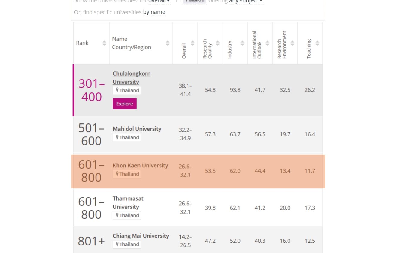 อันดับโลก 601-800 มหาวิทยาลัยขอนแก่น