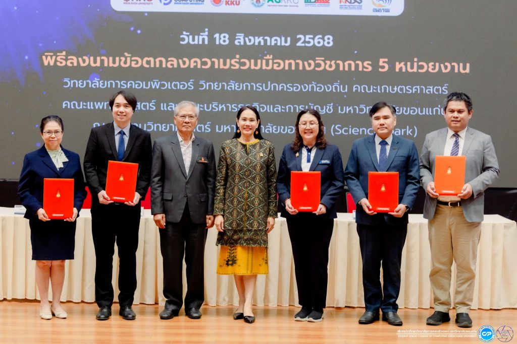 เมื่อวันที่ 18 สิงหาคม 2568 คณะบริหารธุรกิจและการบัญชี มหาวิทยาลัยขอนแก่น ร่วมพิธีลงนามข้อตกลงความร่วมมือทางวิชาการ (MOU) ระหว่างหน่วยงานภายในมหาวิทยาลัยขอนแก่น จำนวน 5 คณะ/วิทยาลัย ประกอบด้วย คณะบริหารธุรกิจและการบัญชี คณะแพทยศาสตร์ คณะเกษตรศาสตร์ วิทยาลัยการคอมพิวเตอร์ และวิทยาลัยการปกครองท้องถิ่น เพื่อร่วมกันขับเคลื่อนการพัฒนาหลักสูตรปัญญาประดิษฐ์ (Artificial Intelligence: AI) แบบบูรณาการข้ามศาสตร์ ณ ห้อง Auditorium อุทยานวิทยาศาสตร์ มหาวิทยาลัยขอนแก่น โดยมี รศ.ดร.เพ็ญศรี เจริญวานิช รองอธิการบดีฝ่ายกิจการนักศึกษาและนวัตวณิชย์ ให้เกียรติเป็นสักขีพยาน และในพิธีมีผู้บริหารระดับคณบดีจาก 5 หน่วยงานร่วมลงนาม ได้แก่ รศ.ดร.สิรภัทร เชี่ยวชาญวัฒนา คณบดีวิทยาลัยการคอมพิวเตอร์, รศ.นพ.ภัทรพงษ์ มกรเวส คณบดีคณะแพทยศาสตร์, ผศ.ดร.ศิริศักดิ์ เหล่าจันขาม คณบดีวิทยาลัยการปกครองท้องถิ่น, ผศ.ดร.สาวิตรี วงศ์ตั้งถิ่นฐาน รองคณบดีฝ่ายแผนยุทธศาสตร์และพัฒนาคุณภาพ คณะเกษตรศาสตร์ และ ผศ.ดร.พงษ์สุทธิ พื้นแสน คณบดีคณะบริหารธุรกิจและการบัญชี